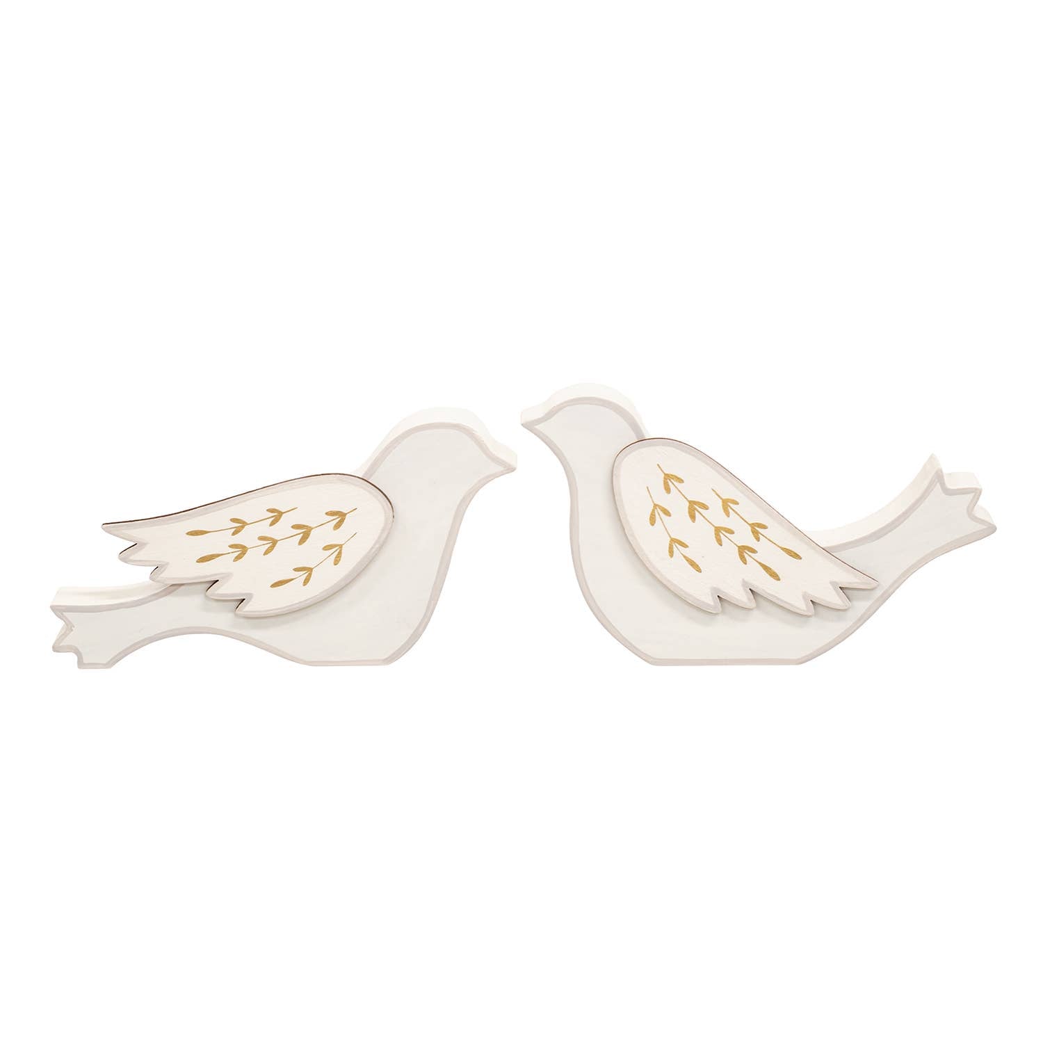 Gold Leaf Wooden Dove Sitters are elegant accents for springtime or special occasion decor. Carved from wood, each sitter depicts the shape of a sitting dove. A white finish brings a versatile touch to each dove, accented by a beige outline. Layered cutout wings adorned with a gold leaf design complete the sitters. Flat bottom edges allow for freestanding display on a shelf or tabletop. The left-facing bird measures 3” high by 5.25” wide by .75” deep, and the right-facing bird measures 2.75” high by 5.5” wide by .75” deep.