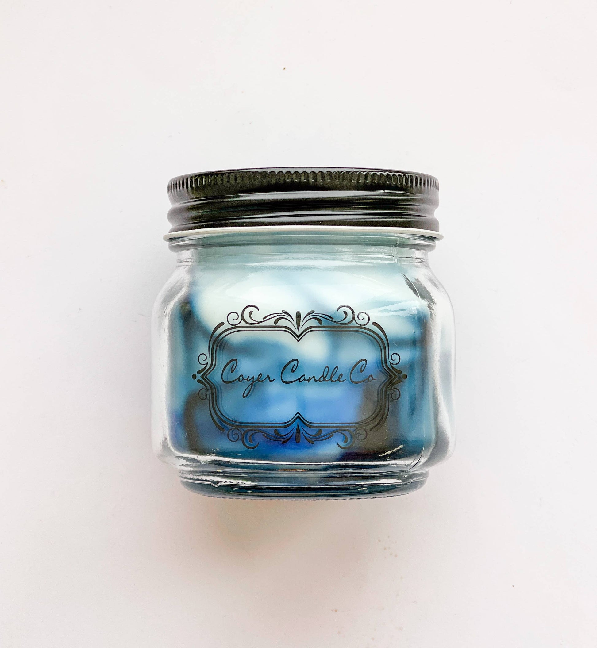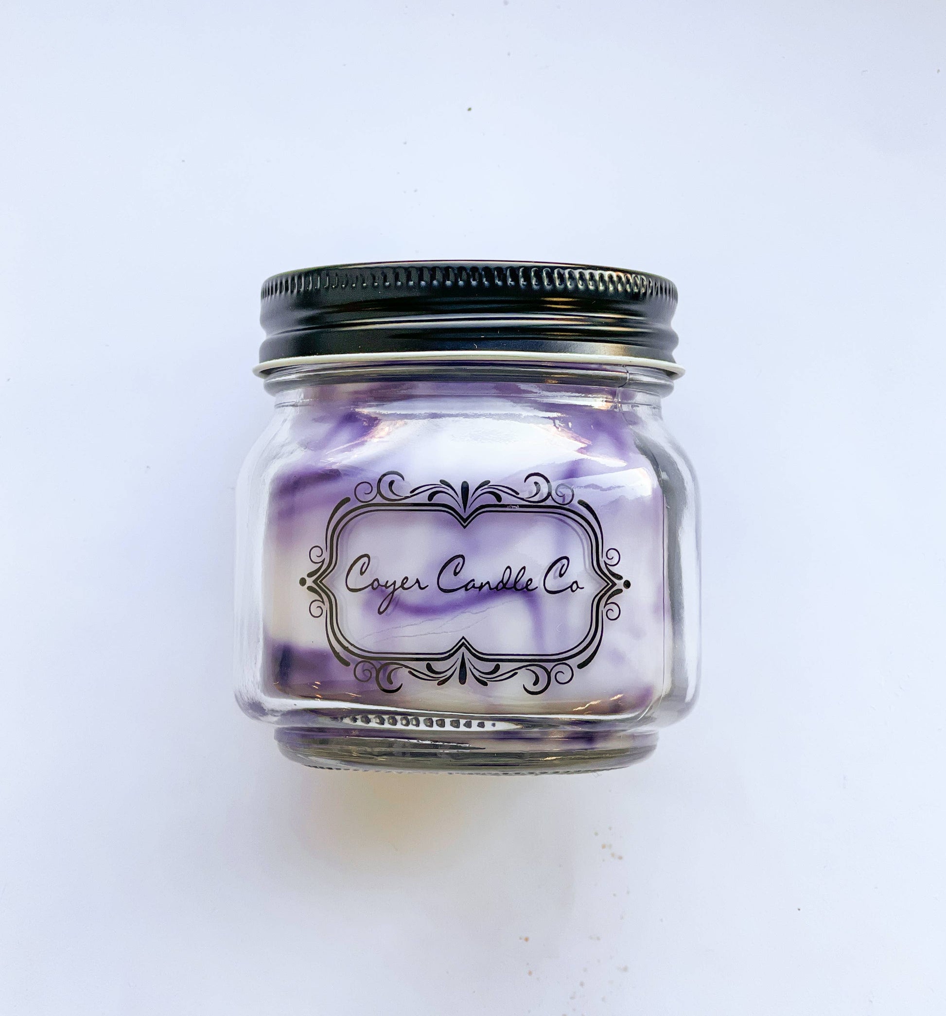 These are 8 oz. size hand-poured, uniquely swirled 100% soy wax candles with 100% cotton wicks and USA made jars, with a burn time of approximately 40 hours.