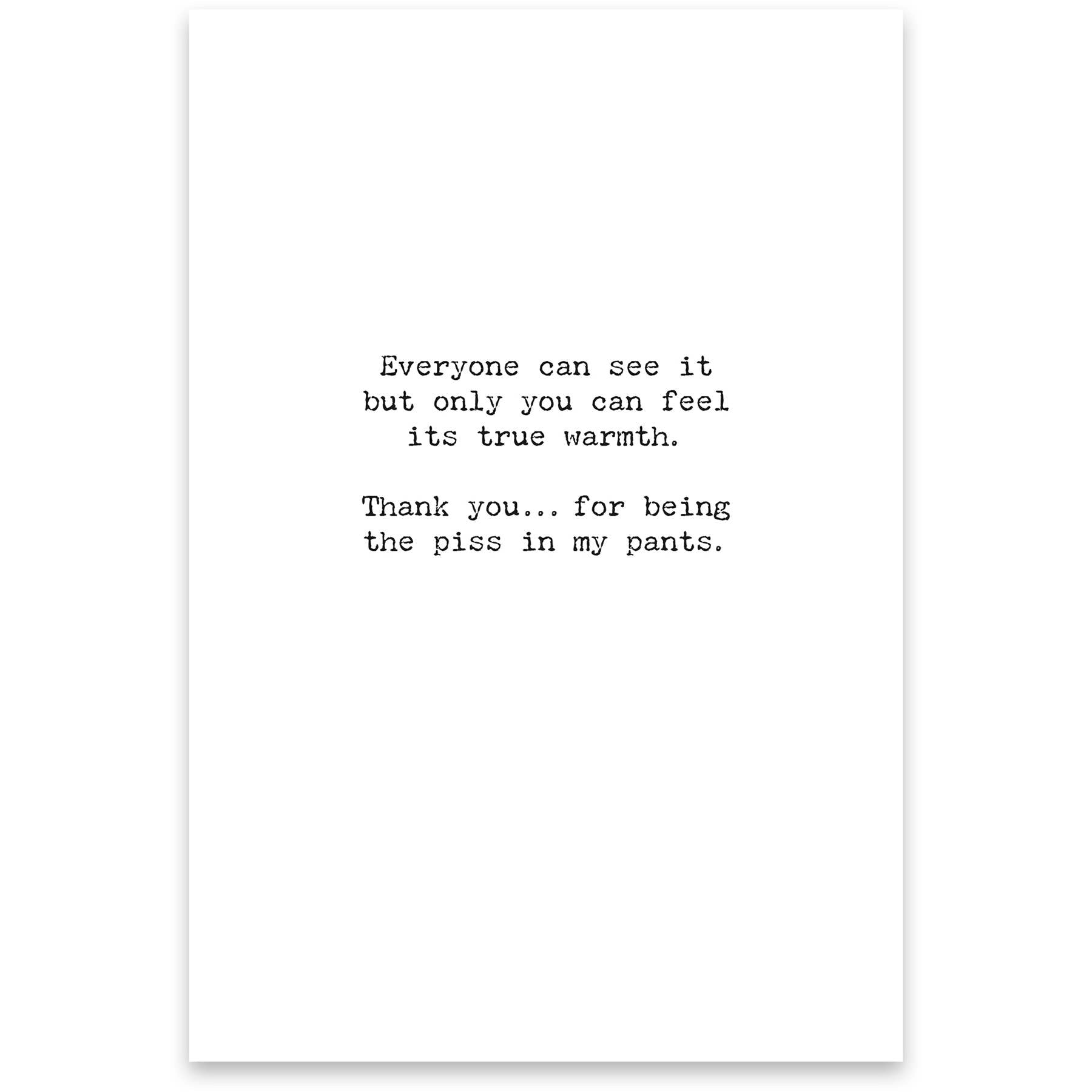 Inside: Everyone can see it but only you can feel it's true warmth. Thank you... For being the piss in my pants.