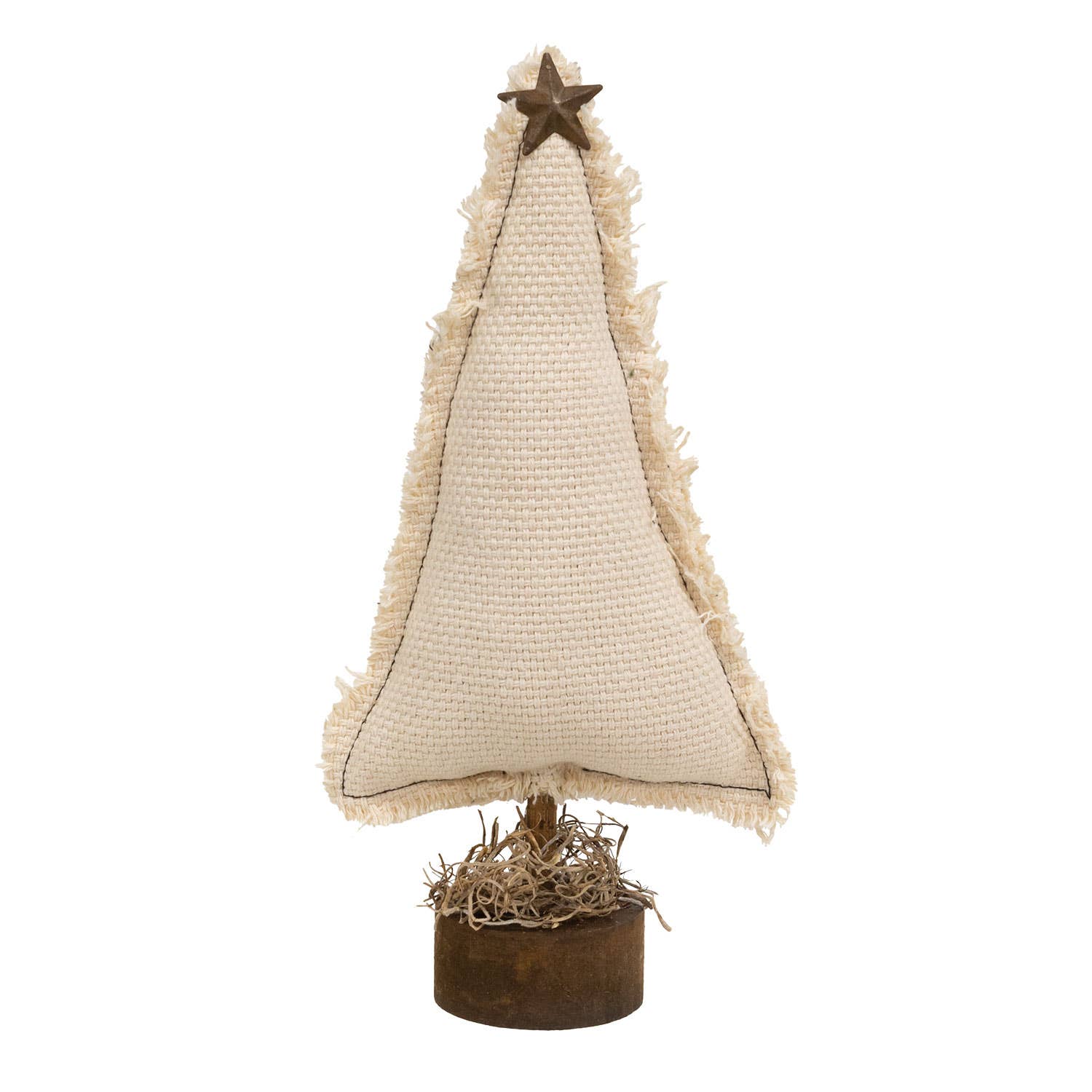 Our 9.5" Fringed Stuffed Ivory Canvas Christmas Tree on Base is topped by a rustic metal star and accented by a tuft of dried moss. This simple, woven fabric tree has great vintage farmhouse style and is perfect for putting together a winter woodland themed collection. Stands 9.5" high by 5" across and 2" deep.