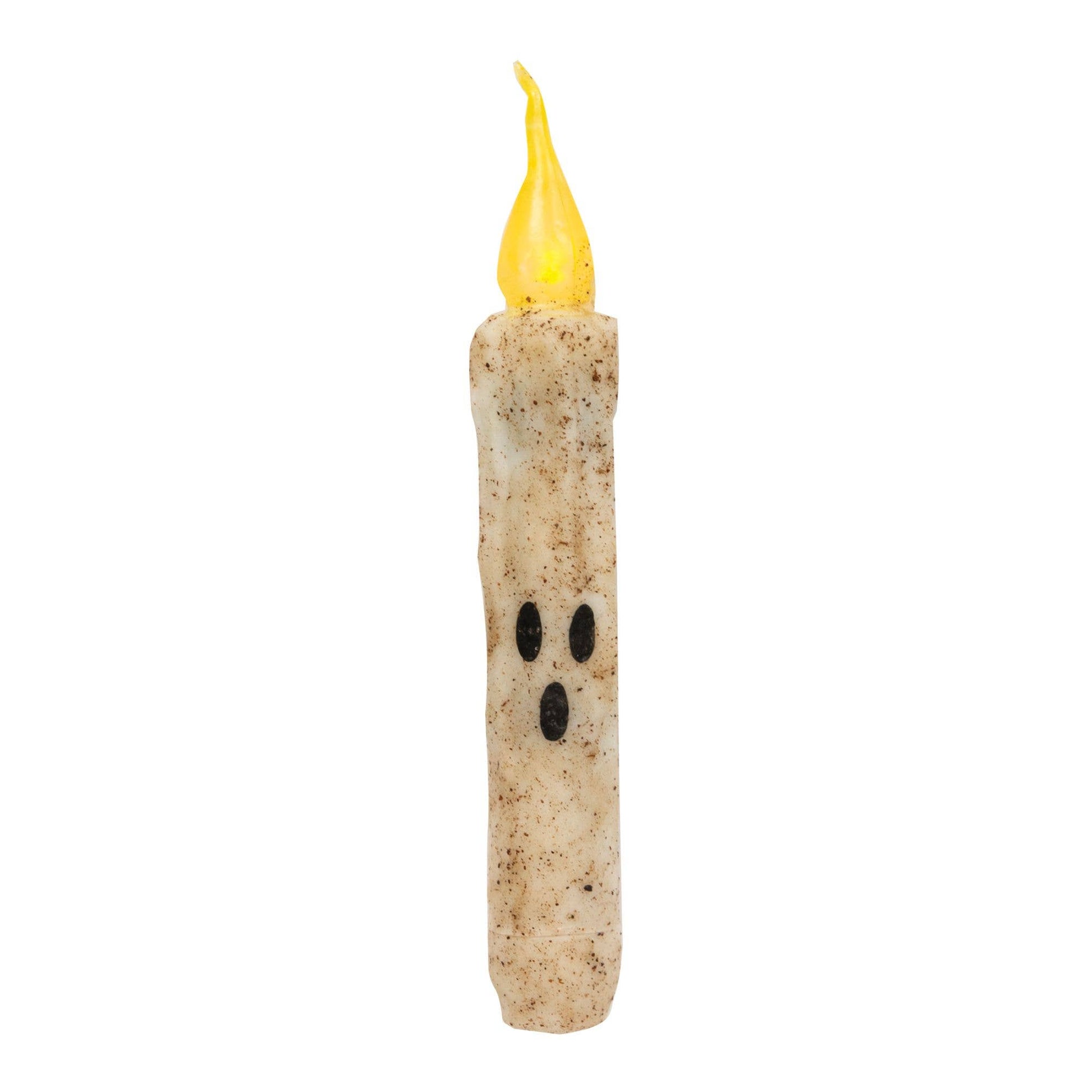 Ghost Timer Taper is a battery-operated timer taper with a textured wax coating and black facial features for a ghoulish finish. Taper has a flame-shaped silicone tip and glows just like a real candle. It has a built-in timer that stays on for 6 hours and then off for 18 hours and it is easily programmable by turning the taper off and turning it back on at a desired time. Taper has a spooky, ghost design and is the perfect accent for the Halloween season. Requires2 AA batteries (not included) and measures 6" high.