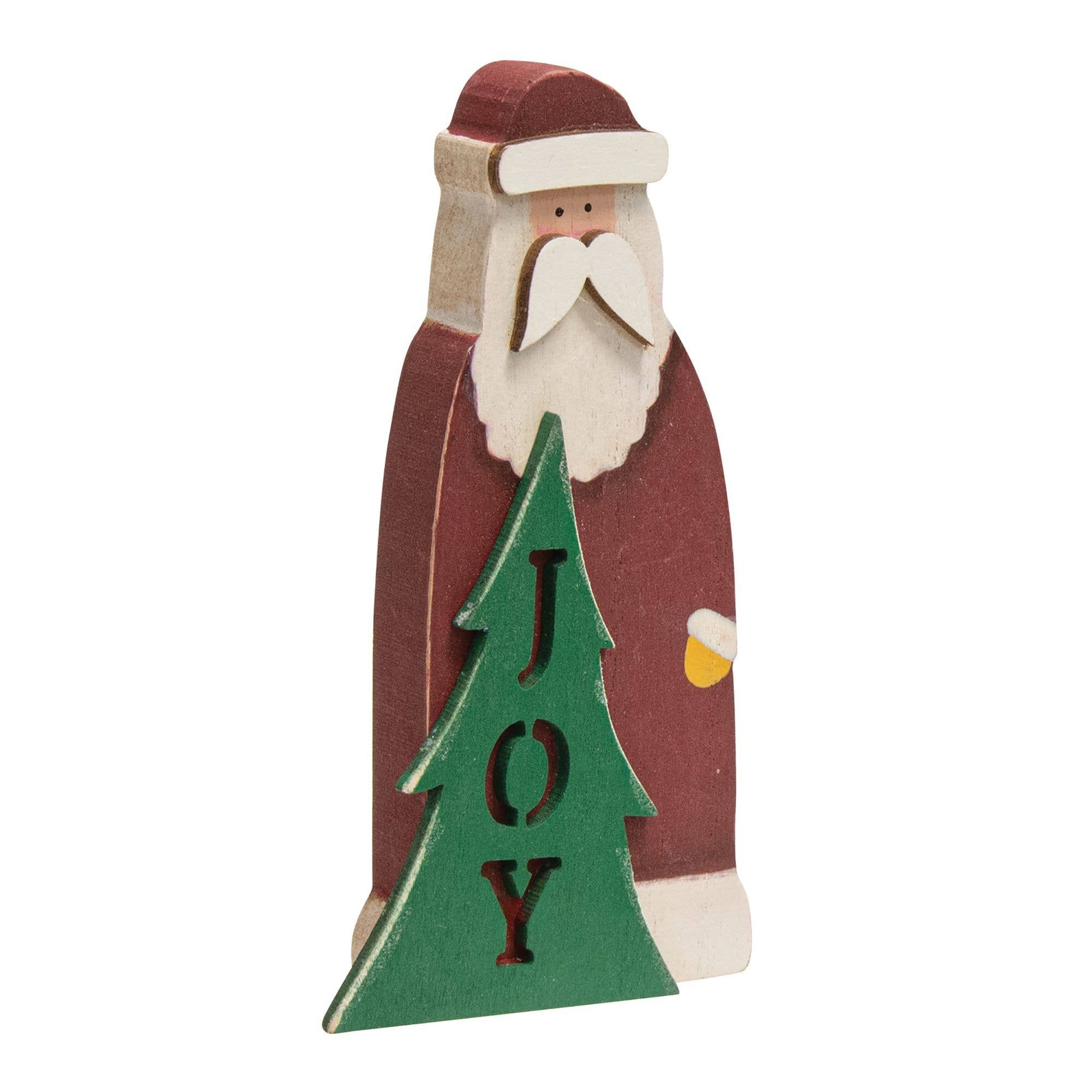 Our Joy Santa Wooden Sitter brings a touch of primitive charm to any shelf or tabletop Holiday arrangement. This wooden sitter is a red-suited Santa with a green cut-out tree which reads "Joy." His mustache is cut-out wood, adding dimension to the face. He stands 5" tall, 3" wide, and 0.5" deep.