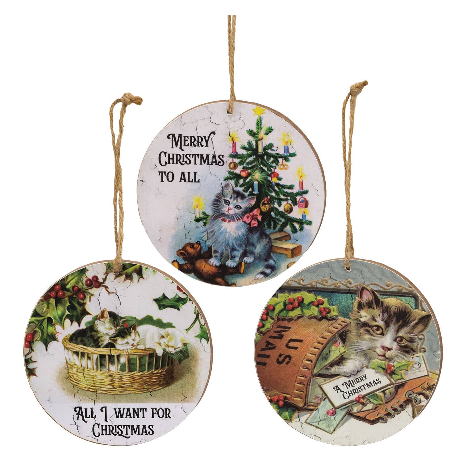 This vintage-inspired ornament showcases 3 assorted Christmas illustrations featuring cats or kittens. Reads either, "Merry Christmas to all," "All I want for Christmas," or "A Merry Christmas." Each ornament has a great antique look and measures 4" across by 0.25" thick. Hangs by a jute string. Please note, this item features an assortment of designs which are priced individually, not as a set. When you order the quantity of 24, you will receive 8 of each design when available.