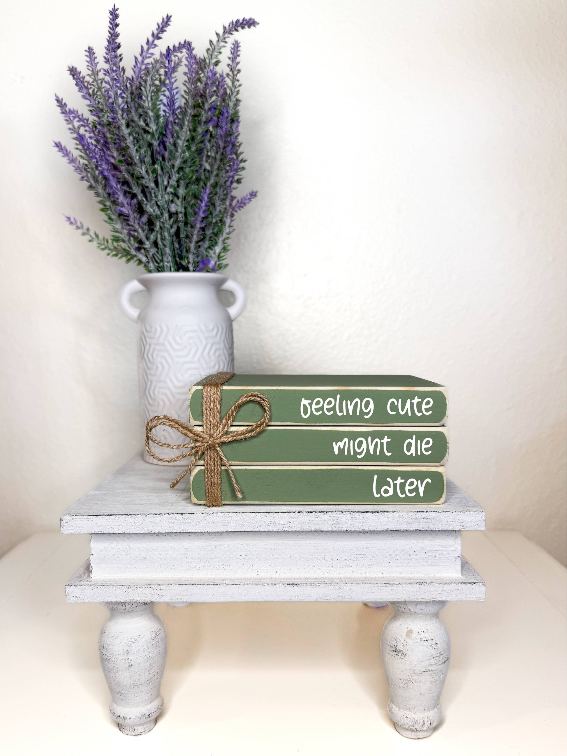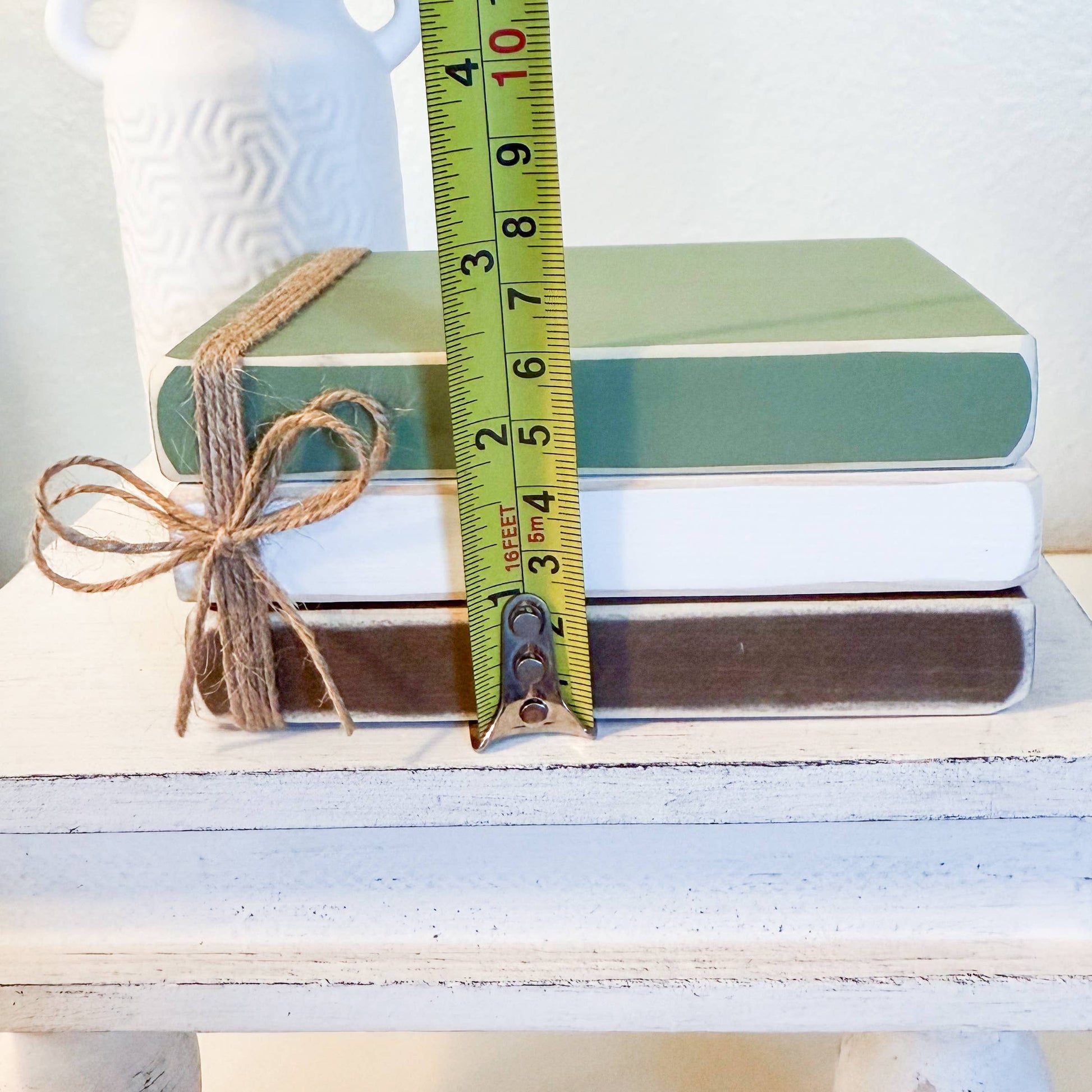 These mini book stacks measure approximately 2.25x5” and are about 3.5” deep. Each book stack is stained or painted first, then sanded to a distressed finish. Words and phrases are applied with permanent vinyl. The mini book stacks are finished off with twine and a double bow for a farmhouse look. Due to the nature of the wood and hand sanding, the patterns and distressing will vary slightly from book stack to book stack.