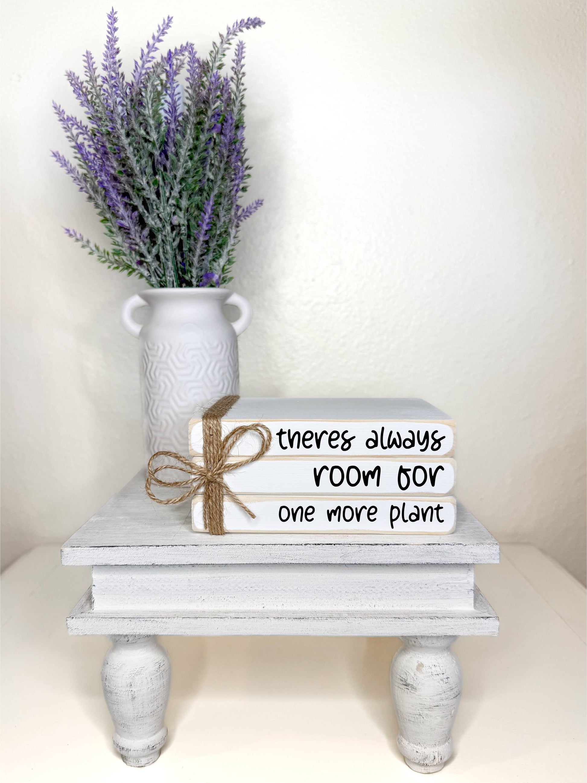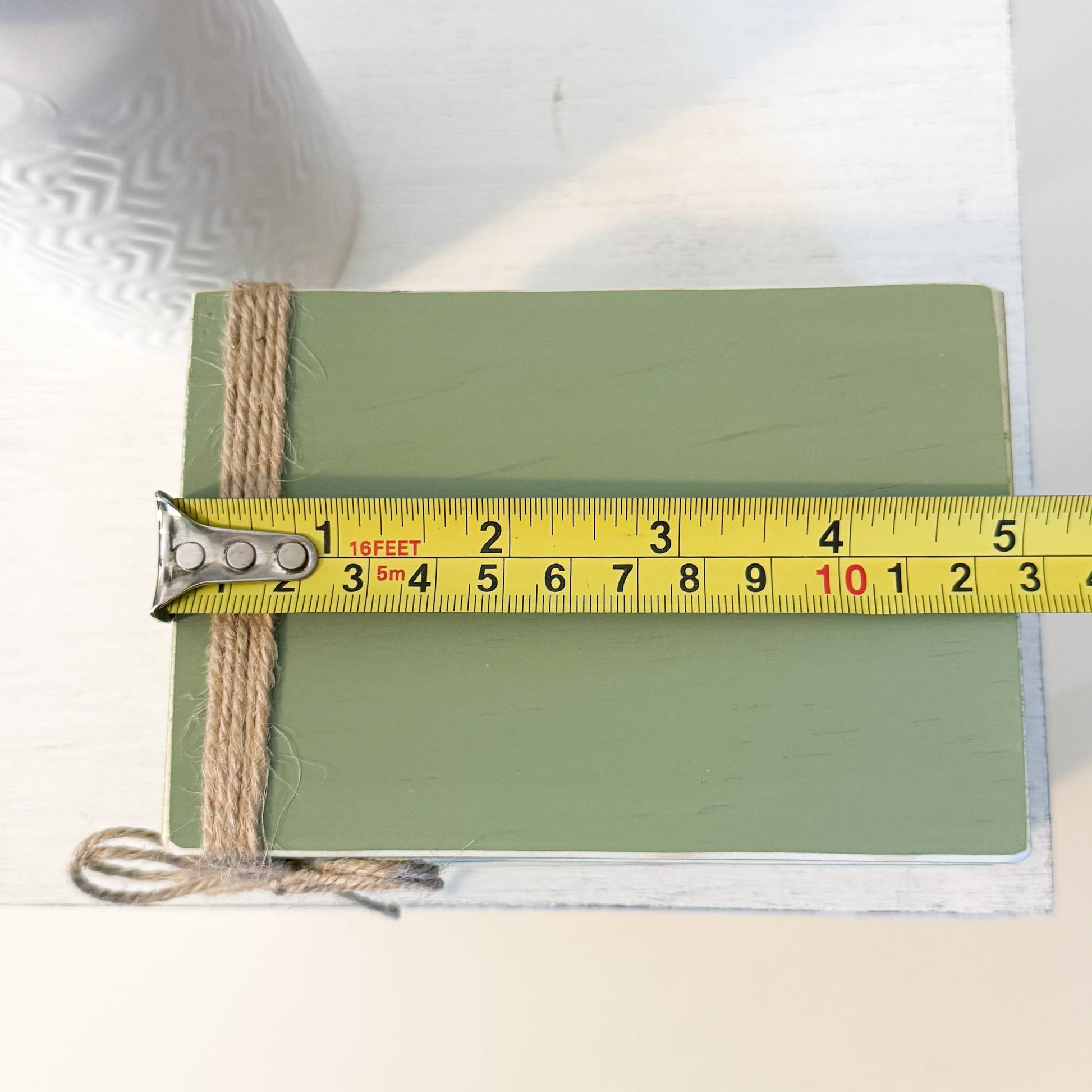 These mini book stacks measure approximately 2.25x5” and are about 3.5” deep. Each book stack is stained or painted first, then sanded to a distressed finish. Words and phrases are applied with permanent vinyl. The mini book stacks are finished off with twine and a double bow for a farmhouse look. Due to the nature of the wood and hand sanding, the patterns and distressing will vary slightly from book stack to book stack.