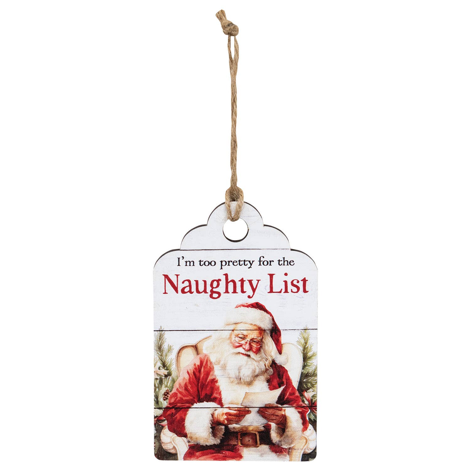 Vintage Santa Naughty or Nice Wooden Tags are playful accents perfect for adding to a Christmas tree, hanging holiday display, or wrapped gift. Crafted from wood, each piece is shaped like a classic gift tag and tied with a looped twine hanger. The tags are painted white with a wood slat look and unfinished edges. Printed design on each tag showcases Santa in a vintage style reading his famous list. One tag reads “permanently on the naughty list,” one reads “I’m too pretty for the naughty list,” and one reads “proud member of the nice list.” Each measures 4.75” high by 3” wide by .25” deep. Please note: This item features a variety of designs which are priced individually (not as a set). When you order the case quantity of 12, you will receive 4 of each style when available.